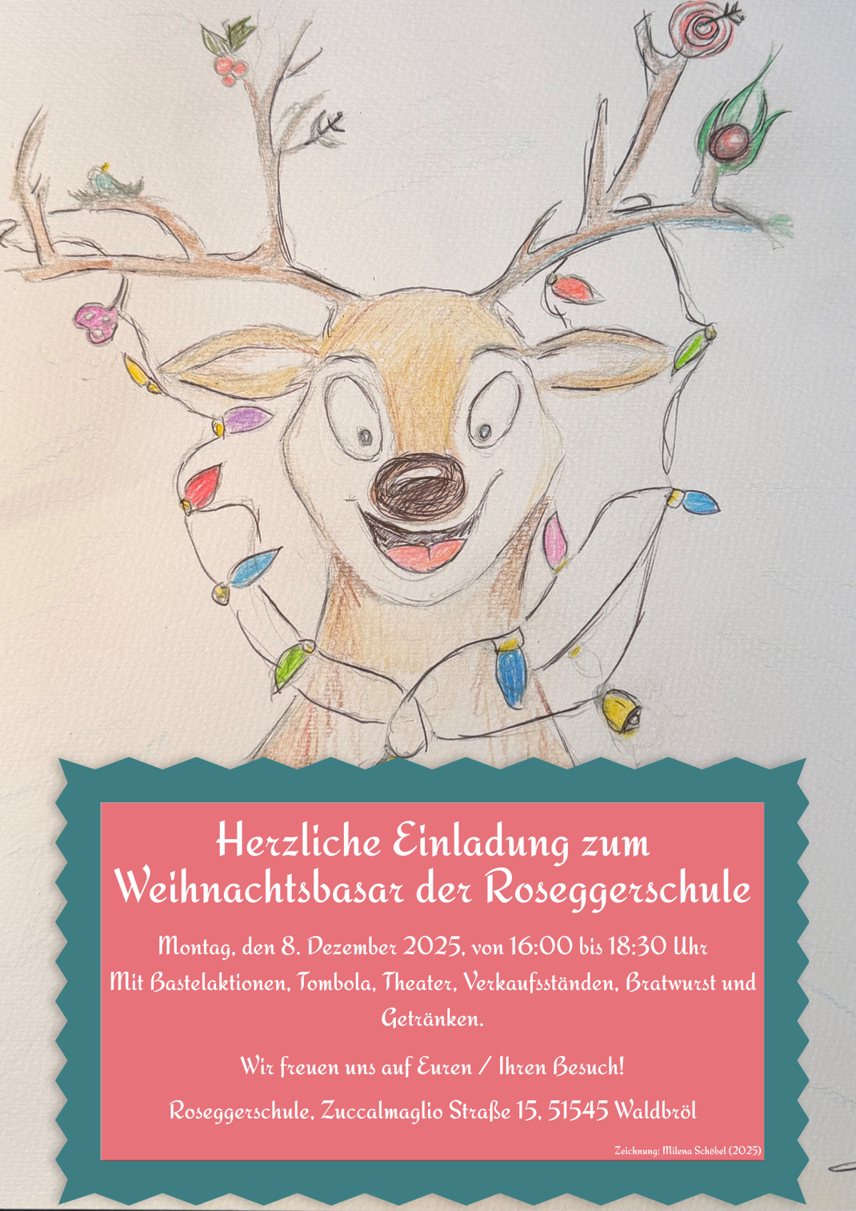 Montag, den 8. Dezember 2025, von 16:00 bis 18:30 Uhr Mit Bastelaktionen, Tombola, Theater, Verkaufsständen, Bratwurst und Getränken. Wir freuen uns auf Euren / Ihren Besuch!